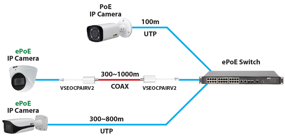 Using a VSEOCPAIRV2 Ethernet over Coax Converter Pair, you can transmit power, video and camera data over coaxial cable, running back to an ePoE NVR or switch. The VSEOCPAIRV2 supports power & data transmission over RG59 coaxial cable at a distance of up to 1000m when used in ePoE systems - even further than over UTP.
