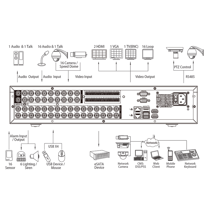 1 x RS232 port (PC comm. & keyboard) / 1 x RS485 (PTZ control) / 1 x RS422 (keyboard) / 1 x LOOP (HDCVI/Composite 8/16 BNC)