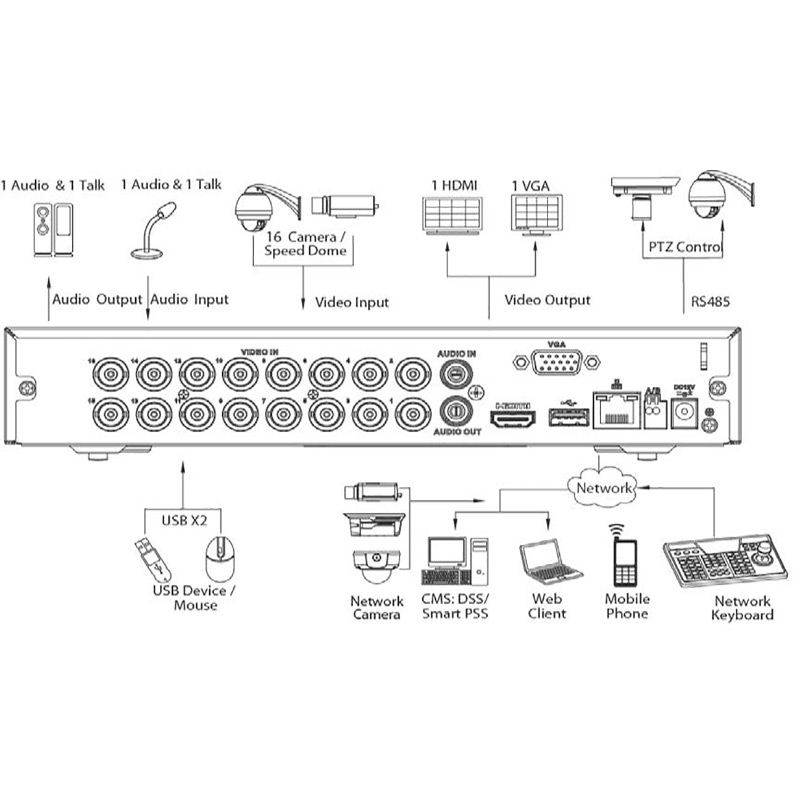 The CVR8EV2 features a single internal SATA port for up to 10TB of HDD storage and has single HDMI and VGA ports for video output.You are able to back up footage via USB device or over the network. This DVR also features comprehensive remote view capabilities (iOS, Android & Windows Phone), including quick configuration of remote view via QR code (excludes Windows Phone).