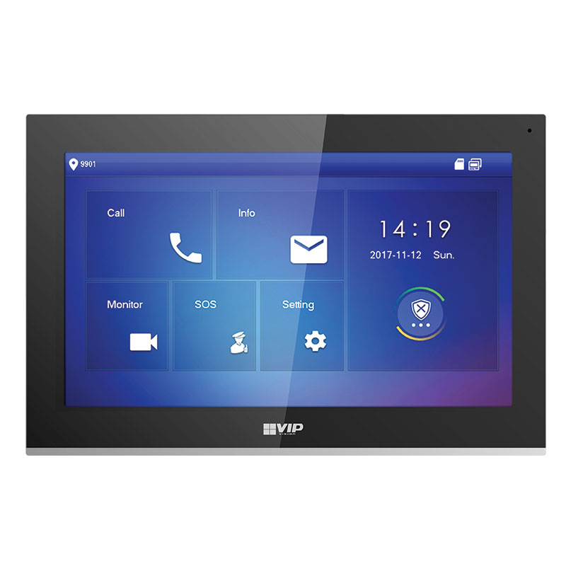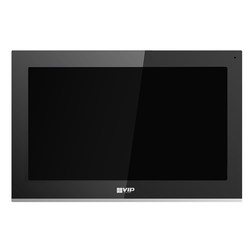 The INTIPMONGBL is a large touch screen indoor monitor that integrates into IP video intercom solutions. The monitor is used for two-way talk with an apartment door station, featuring live-view of the door station camera.