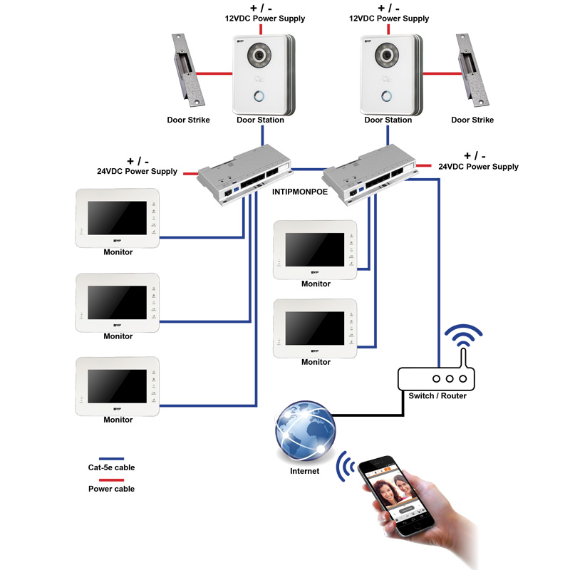 • Facilitates network and power via CAT5e for up to 6 x IP indoor monitors