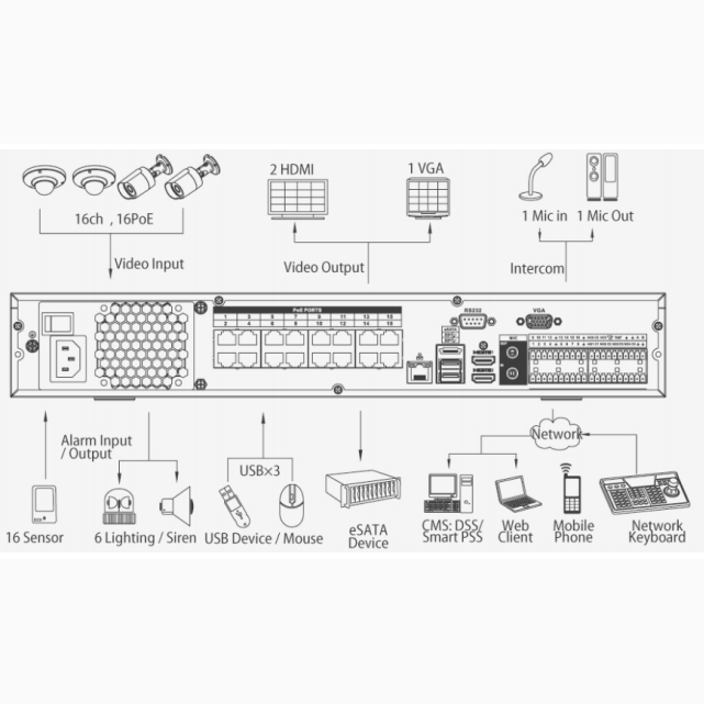 It features a built-in 16 port Power over Ethernet (PoE) switch, supplying camera power, video, audio and PTZ control data across a single ethernet cable.The NVR supports up to 256Mbps incoming bandwidth and can record beyond full HD video at a maximum resolution of 12.0MP (4000 x 3000).
