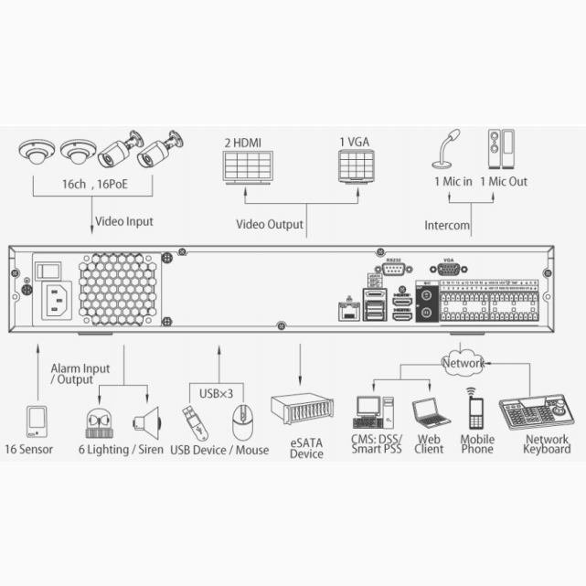 This NVR requires external Power over Ethernet (PoE) switches. The NVR supports up to 256Mbps incoming bandwidth and can record beyond up to 12MP resolution (4000 x 3000).