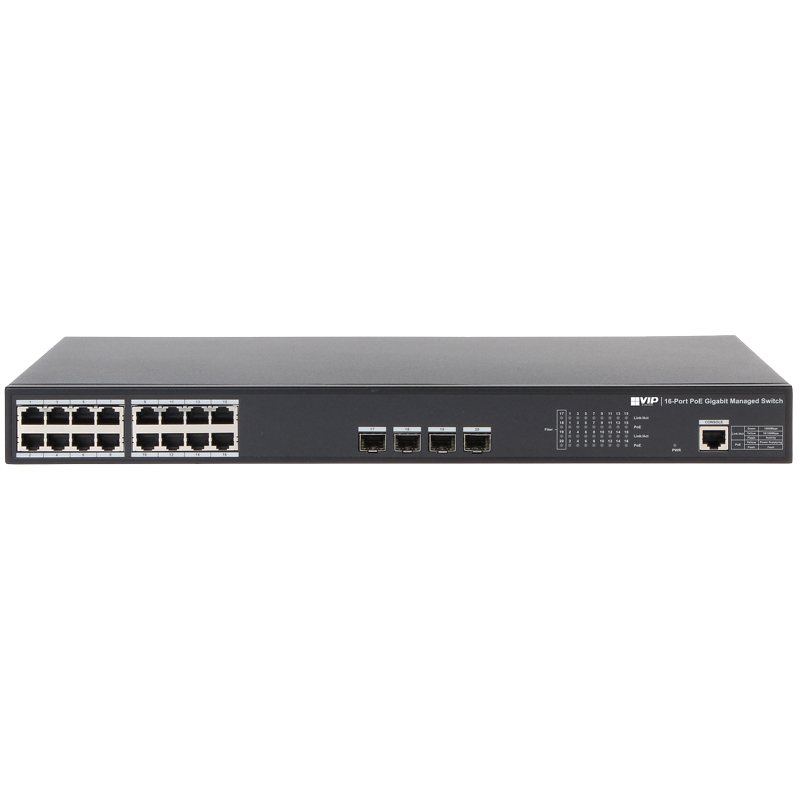 The VSPOE-SWB16G is a 16-port managed Gigabit PoE network switch. Each port on this L2 managed switch is 10/100/1000 Base-T, allowing for ultra fast 1000Mbps downlink speeds for the most demanding of network applications, including fibre-optics.