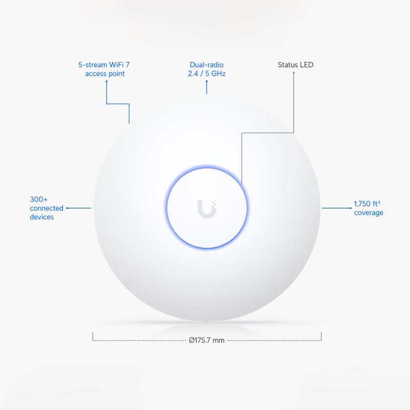 The WT5-U7LR, Ubiquiti UniFi U7 Long Range, is a compact, long range, high speed access point that utilises WiFi 7 technology to provide strong and expansive wireless coverage to enterprise networking environments, up to 160m².